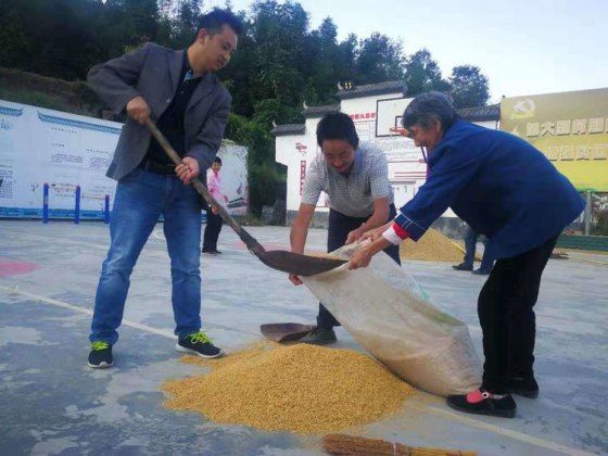傍晚六点:结束一天工作的帮扶干部回到村委会帮助贫困户收拾晾晒的稻谷