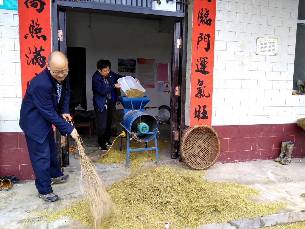 图6:连绵的阴雨给群众秋收带来不便,帮扶干部利用晴好天气,帮助贫困户收割晾晒水稻,确保颗粒归仓。