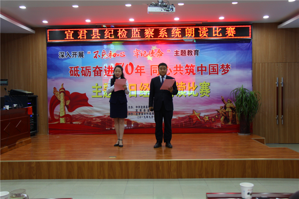 国庆前夕,宜君县举办纪检监察系统“砥砺奋进七十年,同心共筑中国梦”主题党日经典朗读大赛。县委常委、纪委书记、监委主任王海峰以普通党员的身份参加本次活动。参赛选手用真挚的感情、温暖的故事、动听的声音,去领悟伟大思想的深刻内涵,去描述五星红旗的鲜艳夺目,去讲述改革开放的波澜壮阔……