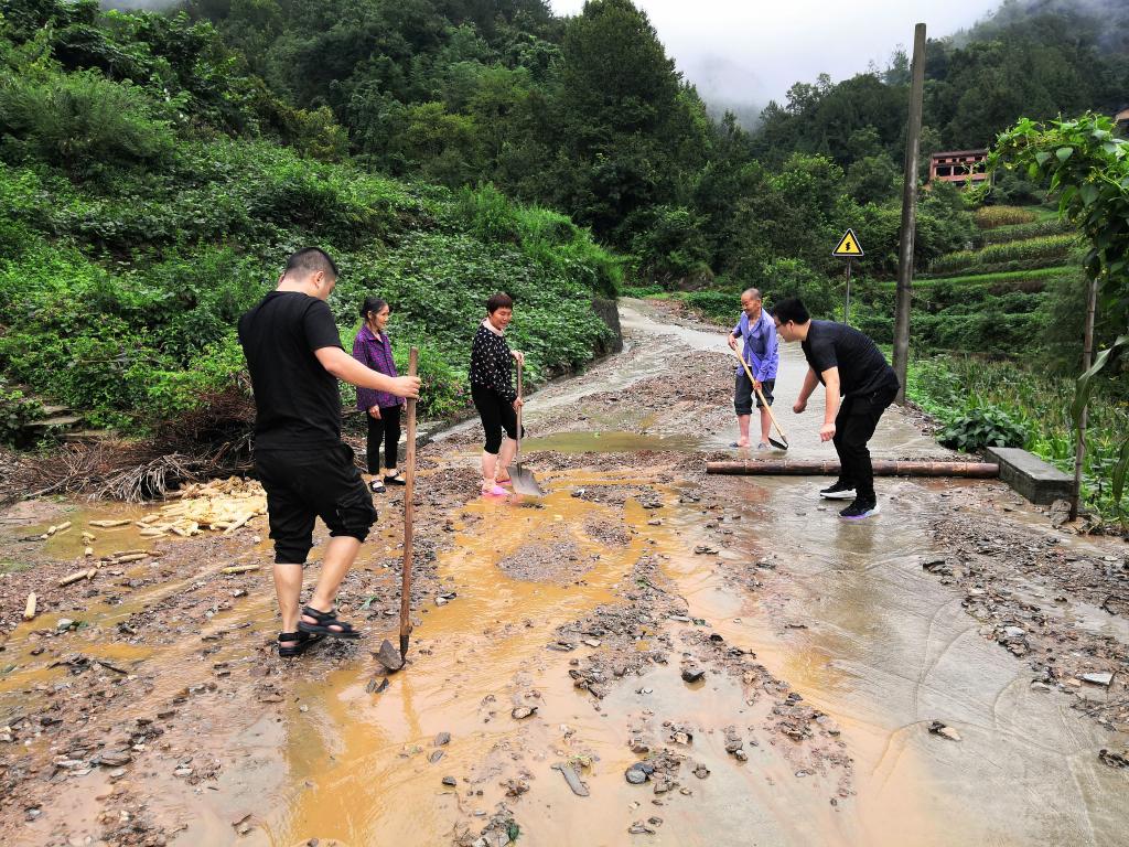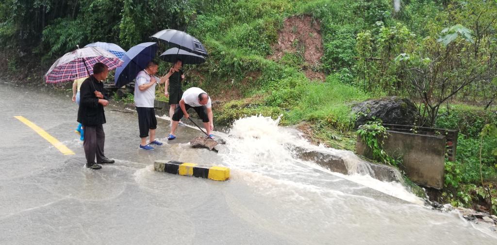 图为汉滨区纪检监察干部在汉滨区朝天河村查家沟查勘水情和道路塌方情况,并对塌方公路进行疏通,对过往行人和车辆进行劝返。