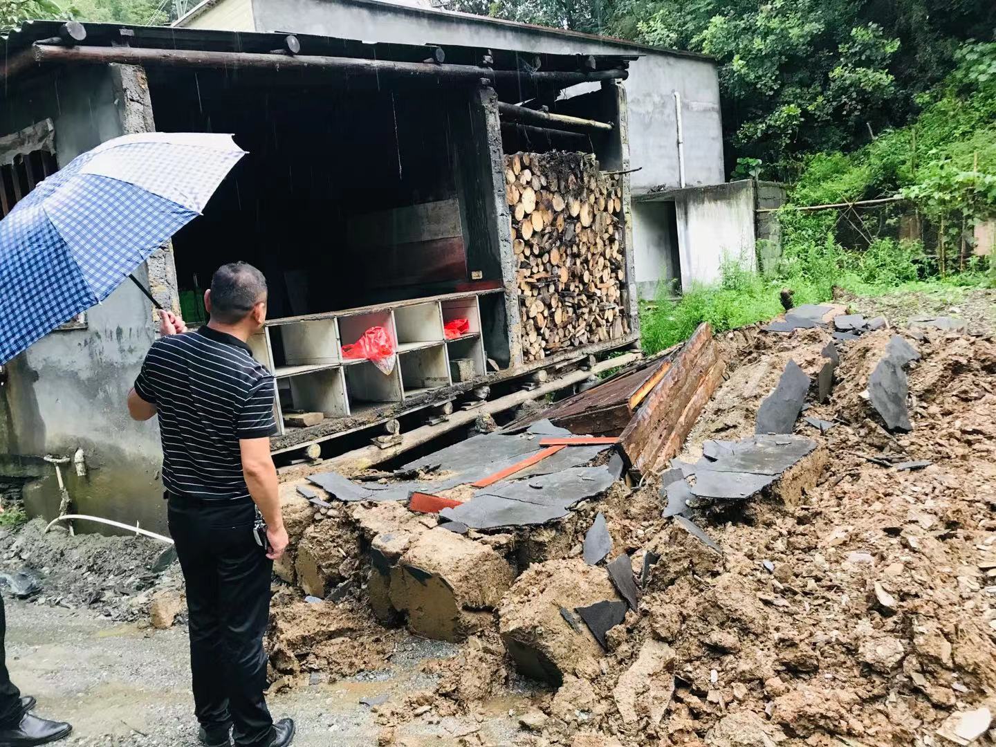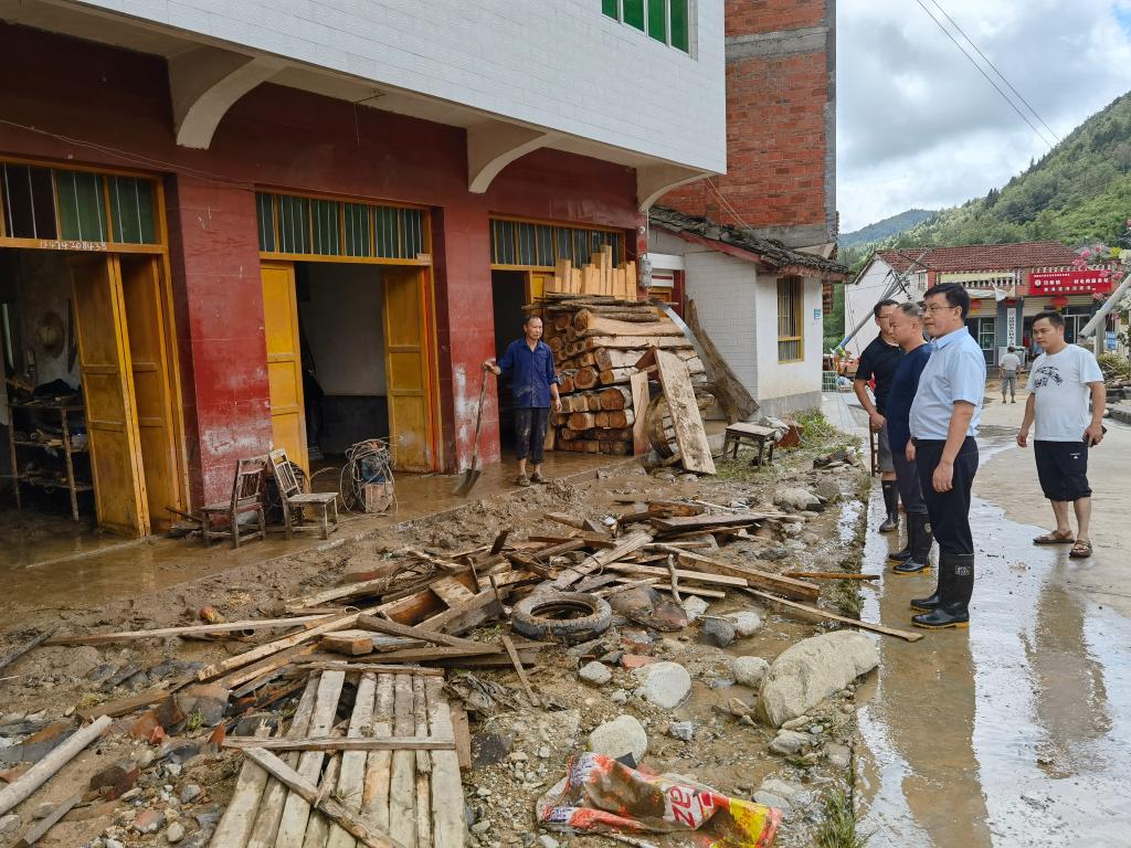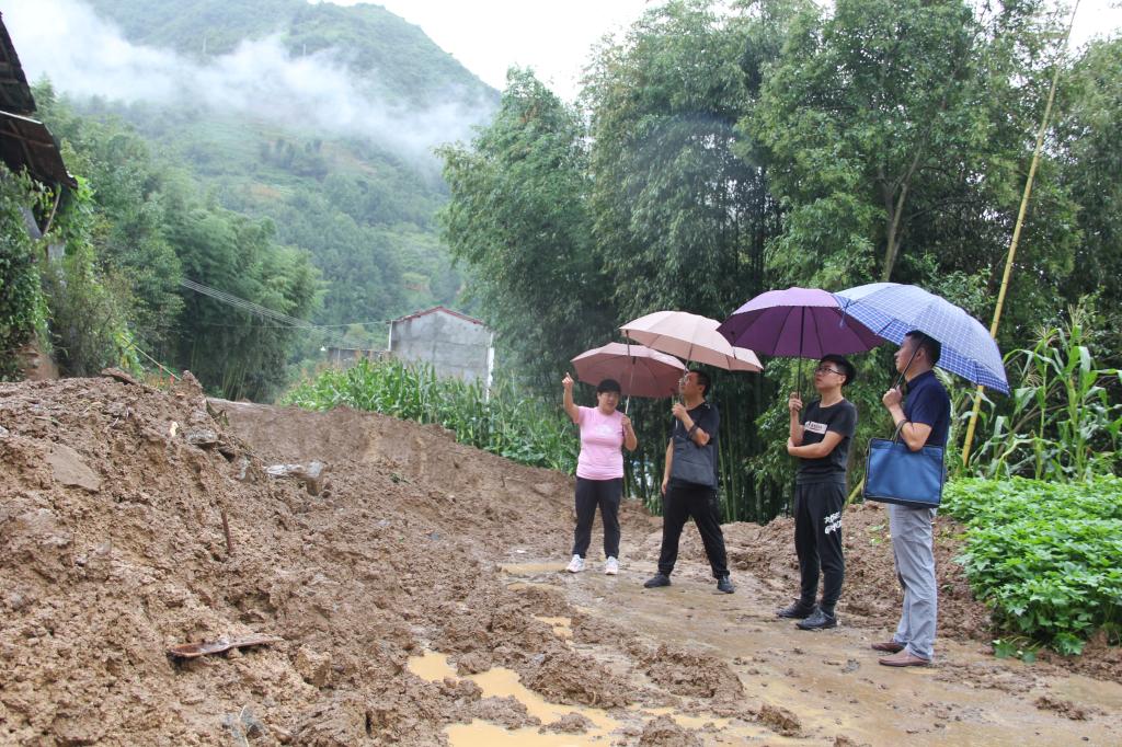 图为岚皋县纪检监察干部在岚皋县堰门镇隆兴村查看灾情。