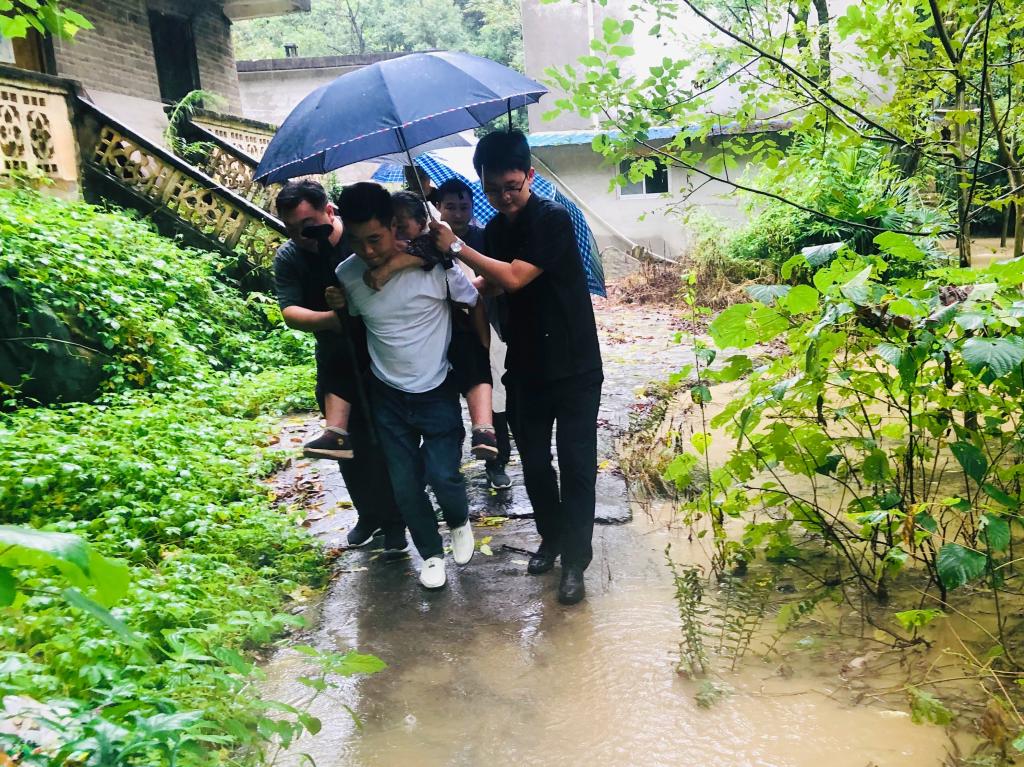 图为汉阴县涧池镇纪委委员沈成在汉阴县马鞍桥村撤离转移危险地带受灾群众。