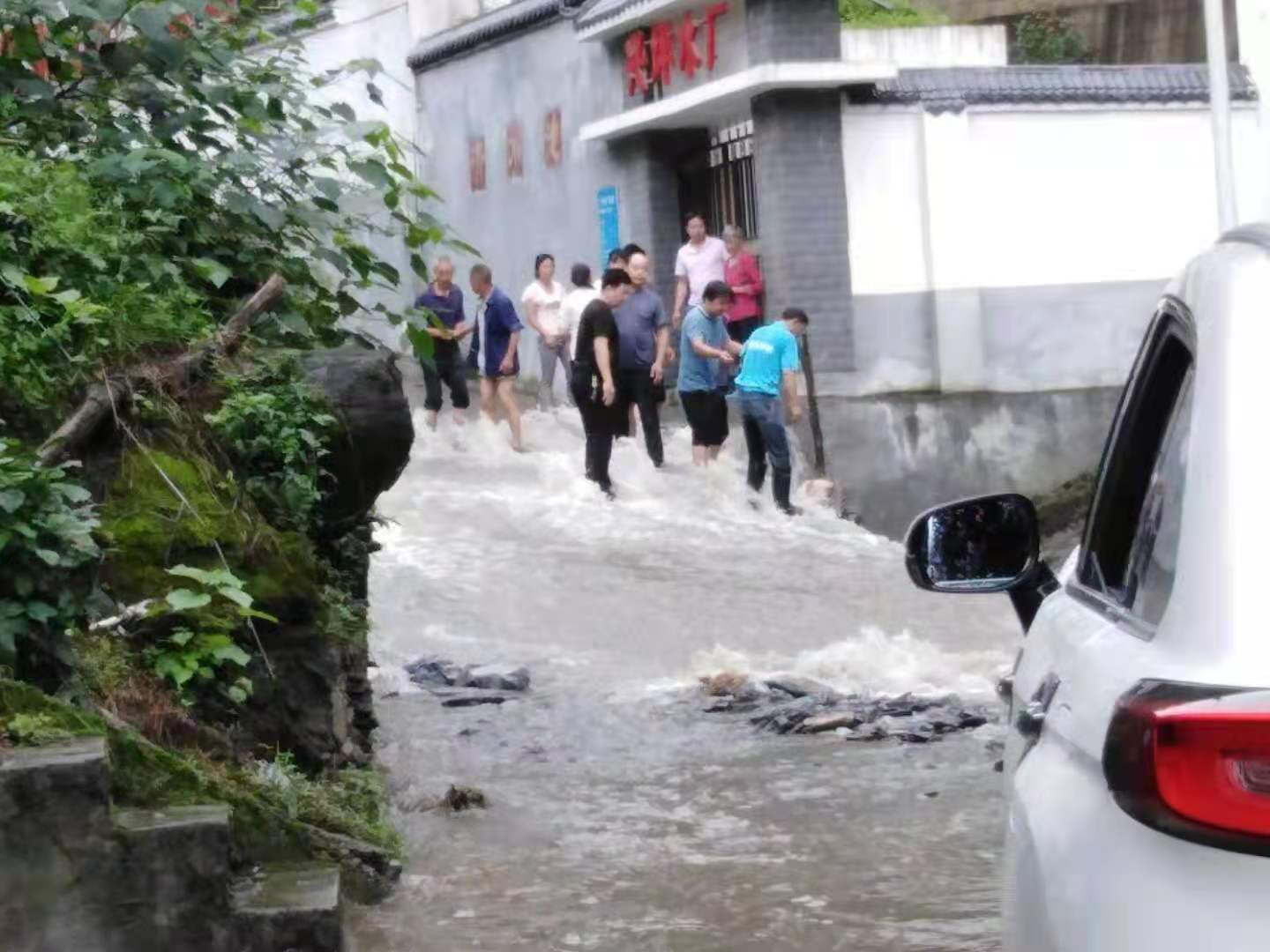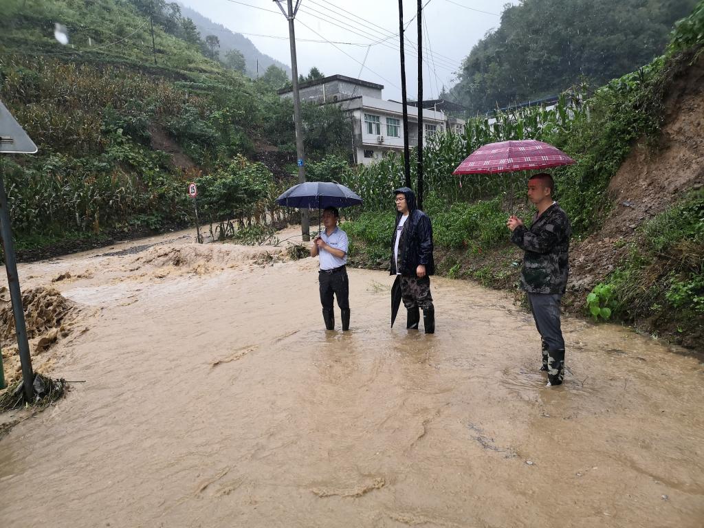 图为白河县双丰镇纪委书记吕健到各村查看受灾情况,对辖区内隐患点再次进行安全排查。