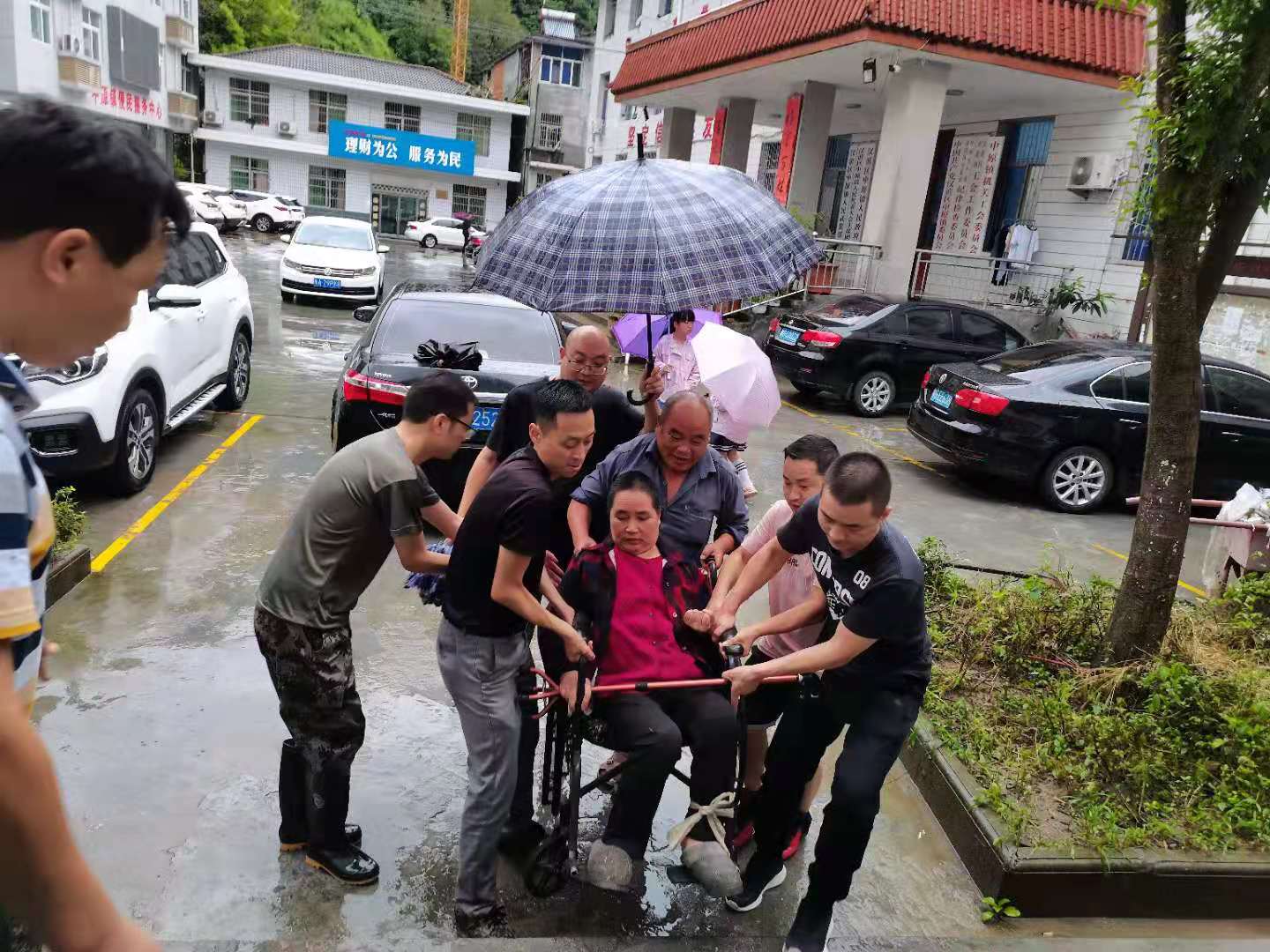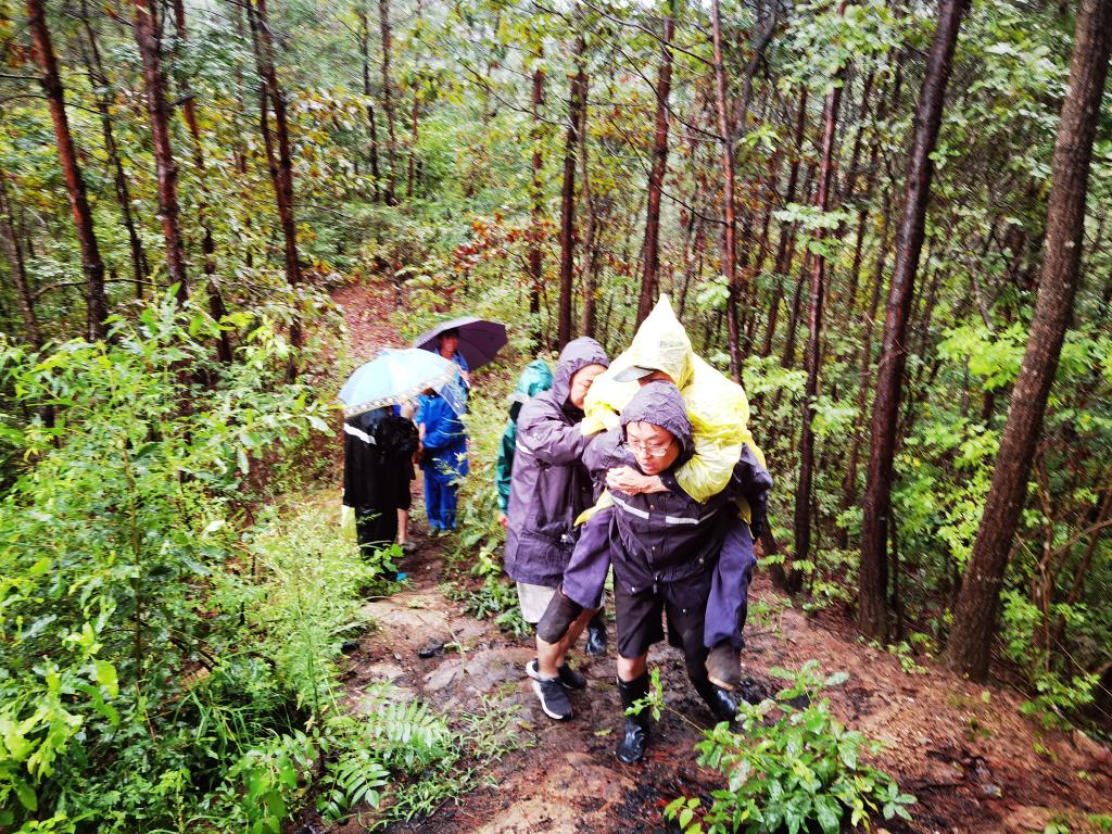 图为8月22日下午,旬阳县桐木镇立石滩村一独居老人的房屋存在安全隐患,桐木镇纪委书记吴永康和镇干部刘涛冒雨将老人转移到亲戚家。