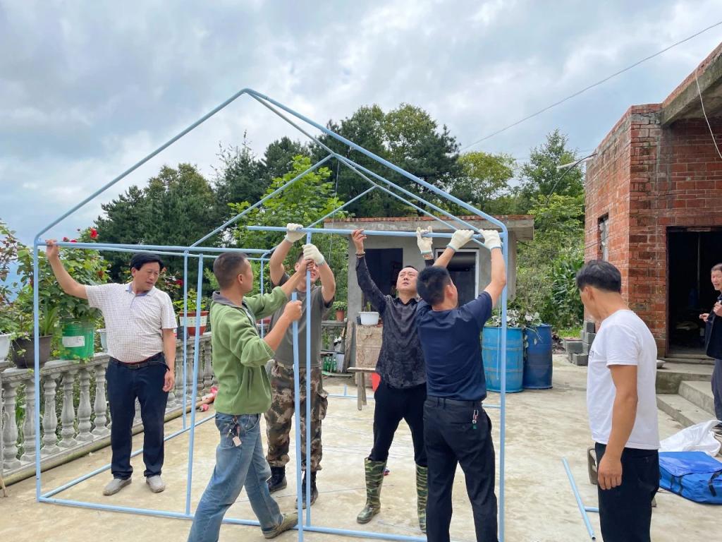 旬阳市金寨镇纪委干部帮助受灾群众搭建救灾帐篷,确保转移的群众有安全住所。
