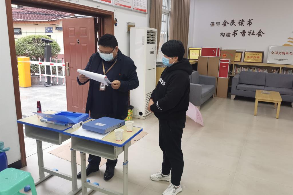 监督检查组在城关镇北街社区居委会查看中高风险地区来石返石人员排查记录。