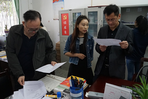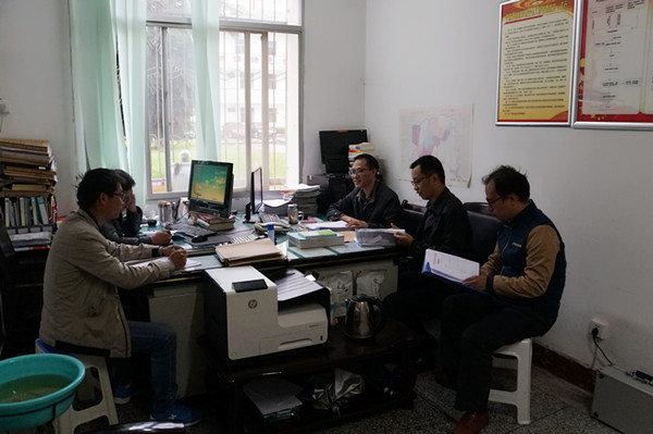 县监委委员刘晓林与第二、第四纪检监察室的干部在商讨审查调查思路。