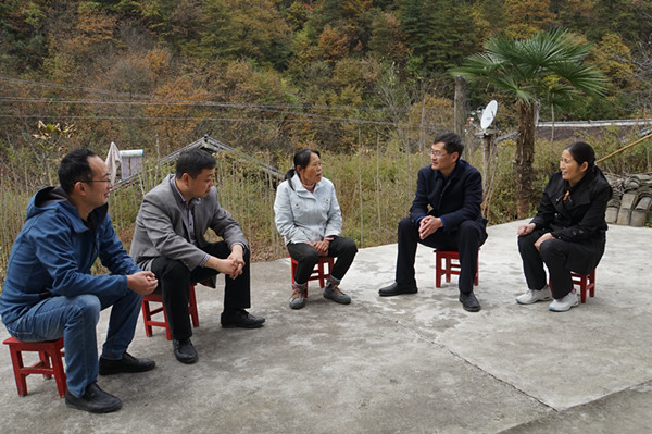 李忠华带领驻村工作队和帮扶干部,在贫困户张明忠家了解灯台七、猪苓等产业发展情况,就发展困惑进行解疑。