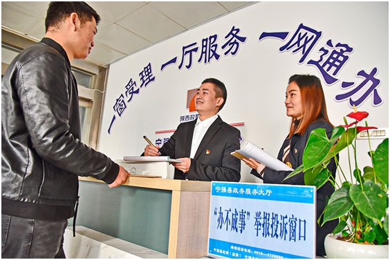 陕西省宁强县纪检监察干部在举报投诉窗口接访,认真记录企业反映的问题并跟踪督办,不断优化全县营商环境。 刘炳林/摄