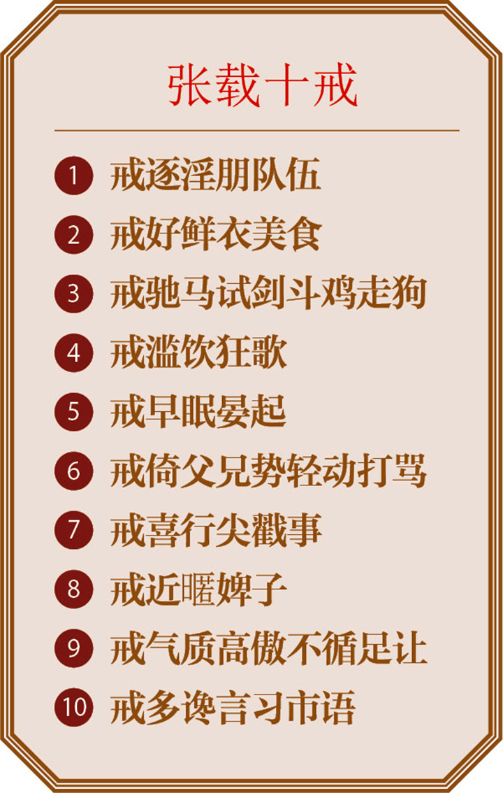 此外,张载晚年还制定“十戒”,为家族子弟划出言行举止的底线。界定清晰、可操作性强的“十戒”,明确了要规避的不良行为,明确了张载对家族子弟的要求,为后世族人的为人处世立下了规矩。