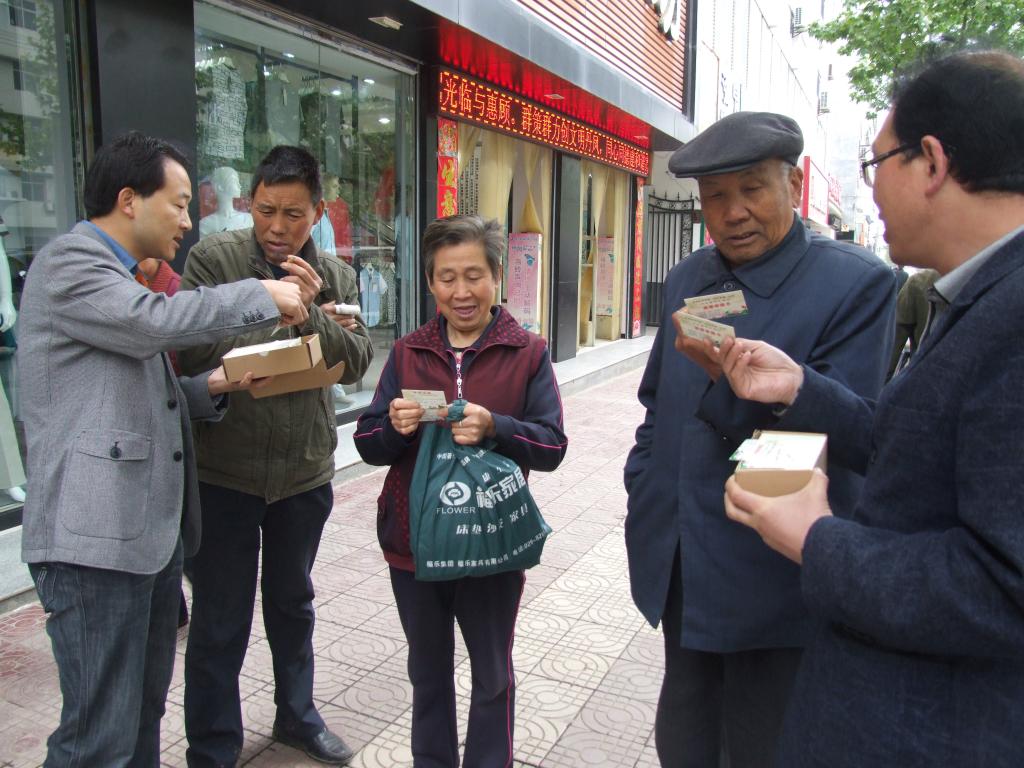 在第二批党的群众路线教育实践活动中,陕西省丹凤县纪委围绕监督落实中央八项规定精神、纠治“四风”,着力畅通监督举报渠道,推行“作风建设监督举报卡”制度。该县纪委将列举的公款吃喝、公款旅游、公车私用、大操大办婚丧嫁娶事宜等11种违反作风建设规定的行为,以及举报方式、受理流程等内容印制成在便携式小卡片,在全县镇村、服务窗口和客商、群众中发放。图为该县纪委工作人员走上街头为群众发放“监督举报卡”。