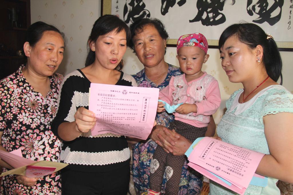 陕西省长安区纪委、监察局近日联合区妇联开展廉洁过节宣传活动,组织人员走街入户,把印有廉洁过节、家庭廉政小故事、廉政格言内容的宣传册发放到党员群众手中。图为9月3日,工作人员在某社区党员家中讲解廉洁过节注意事项。