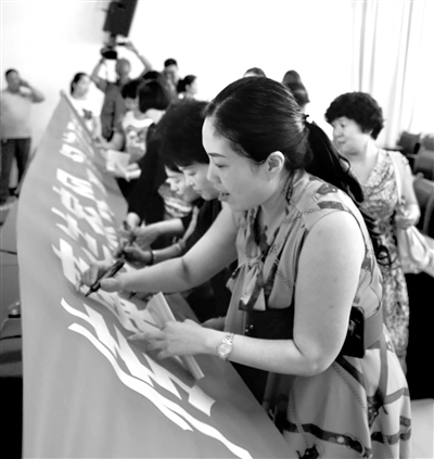 6月18日,陕西省华阴市纪委、市妇联为领导干部家属举办“家庭助廉”培训班,提醒干部家属把好“廉洁关”、当好“廉内助”。图为干部家属签名承诺争当“廉内助”。