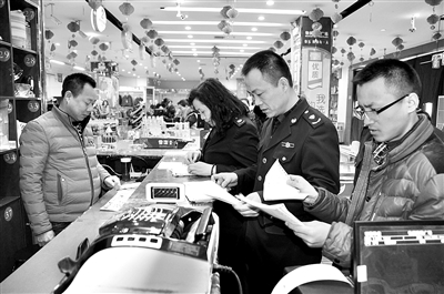 陕西省西安市高陵区纪检监察机关近日会同工商部门对前期刚刚检查过的大型超市再杀“回马枪”,仔细检查公款购买商品账目,深入挖掘问题线索。图为检查组人员在查验发票。