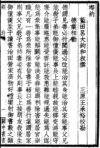 《吕氏乡约》也称《蓝田乡约》,由陕西蓝田的吕大钧兄弟于北宋神宗熙宁九年(1076年)制定并在当地推行。该乡约对村民道德行为规范和乡村治理模式都产生了重大影响。
