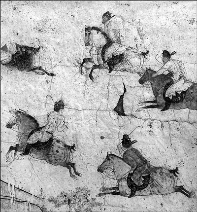马球在唐代是一项很流行的运动。本图为唐章怀太子李贤墓中的打马球壁画,现藏陕西历史博物馆。(资料图片)