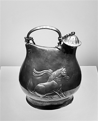 唐代鎏金舞马衔杯纹银壶,出土于西安何家村唐代窖藏遗址,为国家禁止出境文物。宋雨 摄