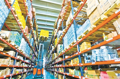 10月20日,甘肃张掖新乐超市物流车间内,工作人员正在调运生活日用品,保障群众的生活需求。 (图片来源:人民视觉)
