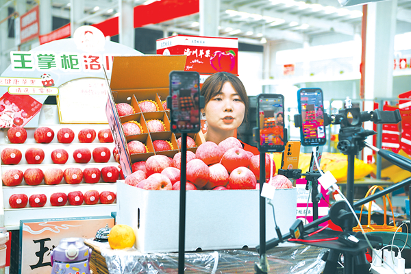 延安市洛川县的苹果企业正在通过互联网直播卖货。刘阳 摄