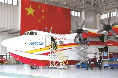 7月23日,大型灭火/水上救援水陆两栖飞机“鲲龙”AG600获签首个型号检查核准书(TIA)。图为近日,陕西蒲城国家民机试飞基地的机库内,机务人员对AG600飞机进行检查。新华社记者 邵瑞 摄