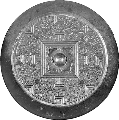 陕西历史博物馆藏有一件汉代四神规矩纹铜镜,背面钮座外围绕着三层凹面大方格,方格四边的中心部各自向外伸出一个T形符号,与连接外区圆周的L形符号相对。大方格的四角又与外区圆周上的四枚V形符号尖端相对。镜子内区被V形符号分割为四等分的区域,其间饰有青龙、白虎、朱雀、玄武四神。人们将V形符号称为“规”,与T形符号正对的L形符号称为“矩”,“规”与“矩”平均分布的纹饰体现了“不以规矩,不能成方圆”的观念。