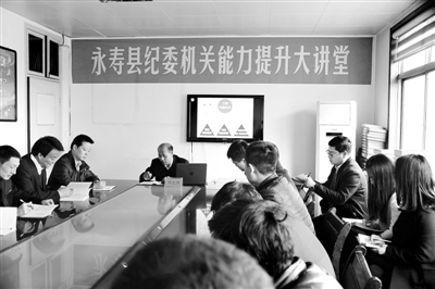 陕西省永寿县纪委机关从3月起,开展“能力提升大讲堂”活动,通过每周一次的集中学习活动,让机关干部讲授理论知识,分享实践经验,为大家提供了一个共同交流、共同提升的平台。图为“大讲堂”活动现场。