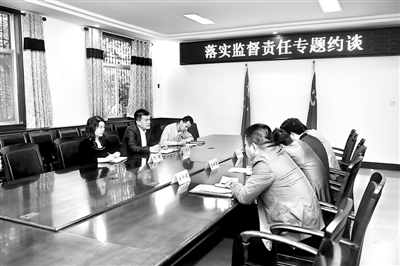 今年以来,陕西省乾县纪委通过约谈的方式,对落实全面从严治党监督责任不力的镇纪委书记进行提醒,督促镇纪委聚焦主责主业,强化责任担当。图为5月8日,该县纪委相关负责人对落实全面从严治党监督责任不力的4名镇纪委书记进行约谈。