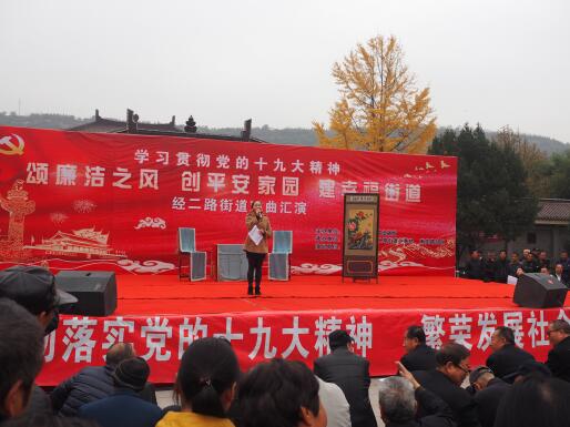 图3为经二路街道办事处纪工委在在炎帝园举办“颂廉洁之风、创平安家园、建幸福街道”戏曲文艺汇演,通过十九大精神、党风廉政等有奖知识问答形式,普及十九大知识。居民群众踊跃参加,现场气氛热烈。