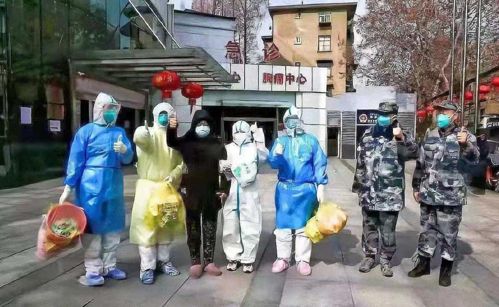 武汉市武昌医院与空军军医大学医务人员护送治愈者出院。(武汉市武昌区纪委监委供 王艳群 摄)