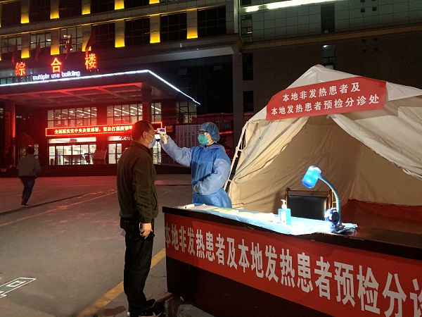 陕西省旬阳县医院将预检分诊关口前移,24小时坚守,对来院人员进行体温测量,全力把好疫情防控第一关。(陕西省旬阳县纪委监委供 马小龙 摄)