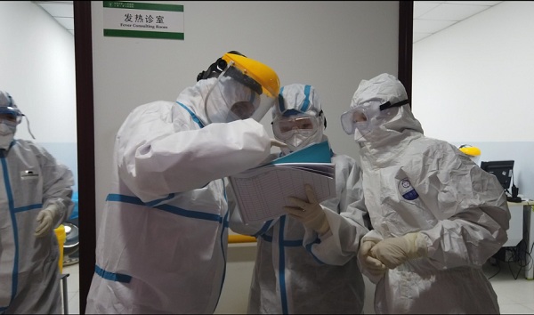 湖北省宜昌市第一人民医院发热门诊作为该市疫情防控的前沿,医护人员对照登记表,核对疑似病例患者病情。(湖北省宜昌市纪委监委供 喻伟 摄)