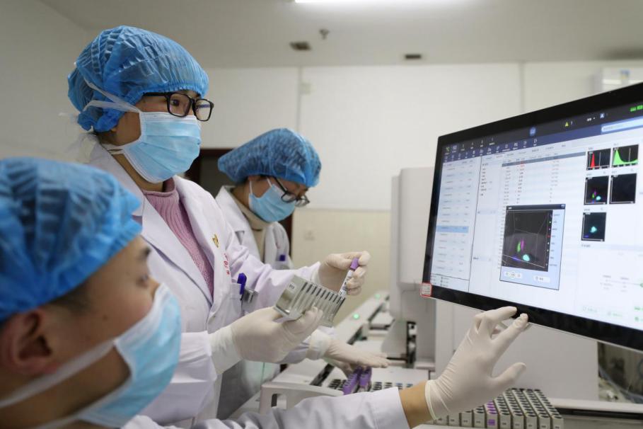 重庆市酉阳土家族苗族自治县人民医院,检验科医生对发热病人检验数据进行分析,为准确定性病情提供科学依据。(重庆市酉阳县纪委监委供 杨春来 摄)