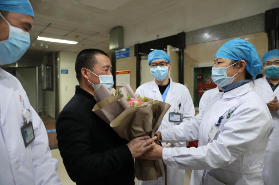 在浙江省乐清市人民医院,经过医务人员的精心治疗,首例新型冠状病毒感染的肺炎确诊患者治愈出院,医护人员与患者相互祝福。(浙江省乐清市纪委监委供 刘言勇 摄)