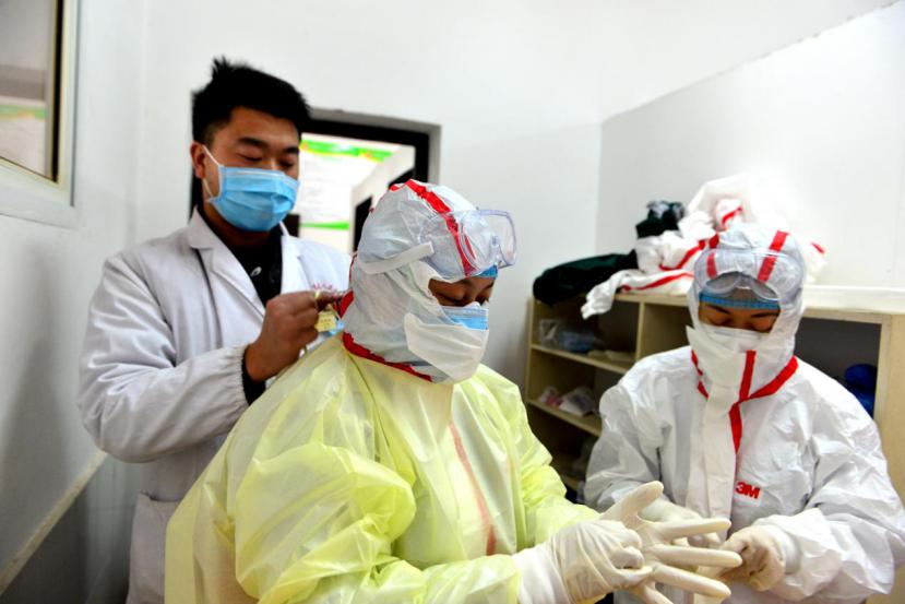 湖南省娄底市双峰县第五人民医院经改造后成为新型冠状病毒感染的肺炎诊治定点医院,医护人员做好防护准备进入隔离区。(湖南省双峰县纪委监委供 李建新 摄)