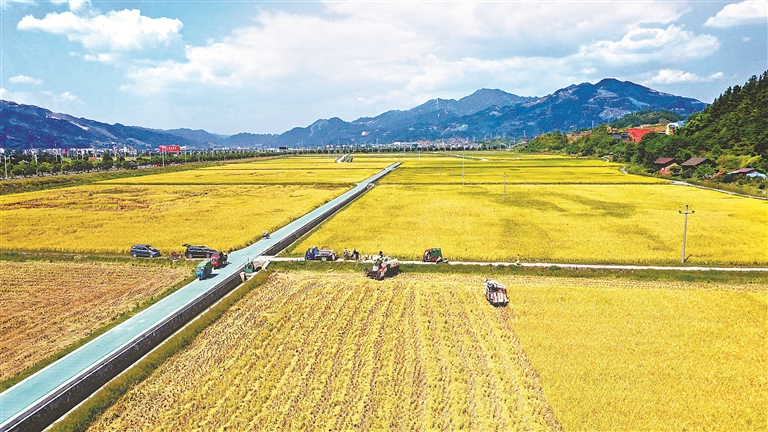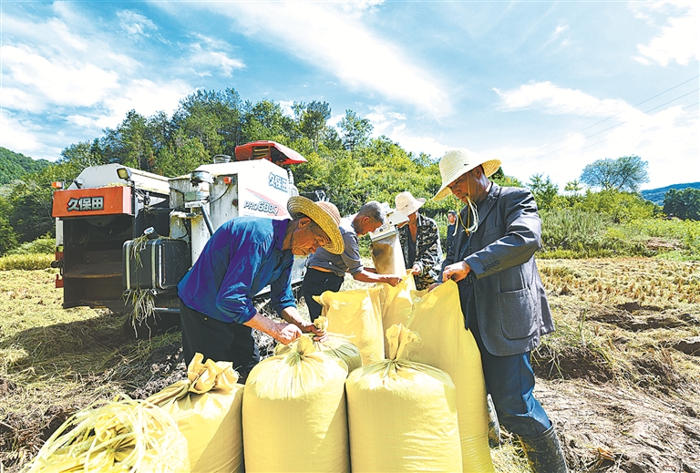 陕西省安康市石泉县城关镇草池湾,300余亩有机水稻丰收,农户抢抓晴好天气,采取农机与人工相结合方式加紧收割,确保稻谷颗粒归仓。 (图片来源:视觉中国)