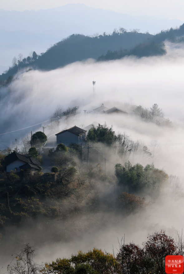 冬日的早晨,海拔较高的陕西省石泉县枫树村云雾缭绕,几户人家享受着“半山深处有人家,依山傍水远繁华”的宁静,宛如一幅山水画。(陕西省石泉县纪委监委供 杨勇 摄)