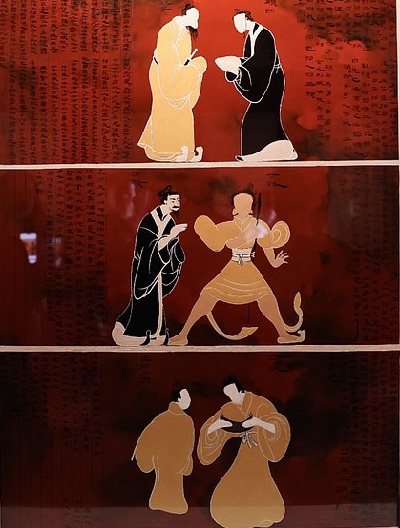 这件文物出现了目前为止,我们已知的最早的孔子形象。镜掩上绘制六个人像,两人一组,分上、中、下三层排布。上层绘孔子与他最得意的弟子颜回;中层绘子赣和子路,子赣就是子贡,古时赣、贡二字是相通的;下层绘子羽、子夏。每个人像旁有篇幅不小的墨书,为人物传记。