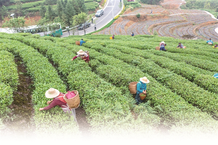 重庆市綦江区立足绿色生态资源禀赋,将茶产业打造成助力乡村振兴的主导产业,让“绿叶子”成为“金叶子”。图为该区石角镇新农村村民在茶园内采摘鲜茶叶。 新华社发
