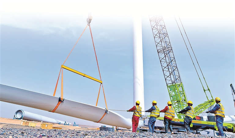 甘肃省高台县境内有戈壁荒漠2000多平方公里,近年来凭借风光资源优势,发力新能源产业赛道。图为该县某新能源风力发电项目建设现场,工作人员正在安装风力发电机。新华社发
