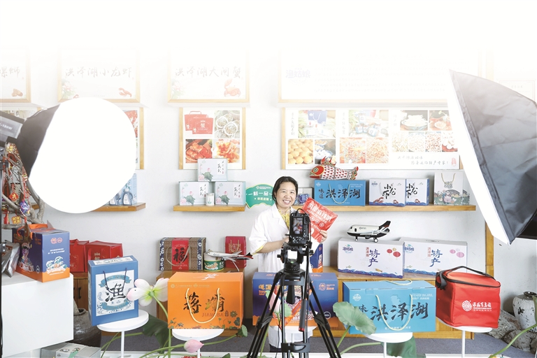 5月21日,江苏省淮安市洪泽区“渔姑娘”助农直播间内,主播正在向网友介绍当地特色农产品。陈凯 摄