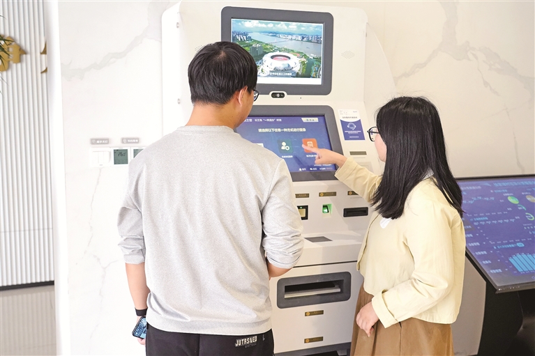 5月10日,浙江省平湖市林埭镇徐家埭村的数智生活馆内,村民在工作人员的帮助下,使用政务服务长三角“一网通办”终端办理业务。金苗 摄