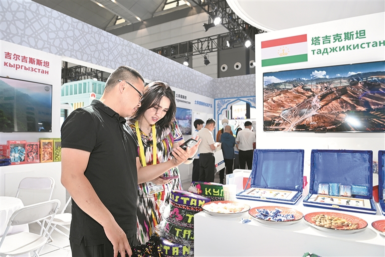 图为近日,在第九届丝绸之路国际博览会暨中国东西部合作与投资贸易洽谈会丝路优品展上,参观者了解塔吉克斯坦商品。新华社记者 李一博 摄