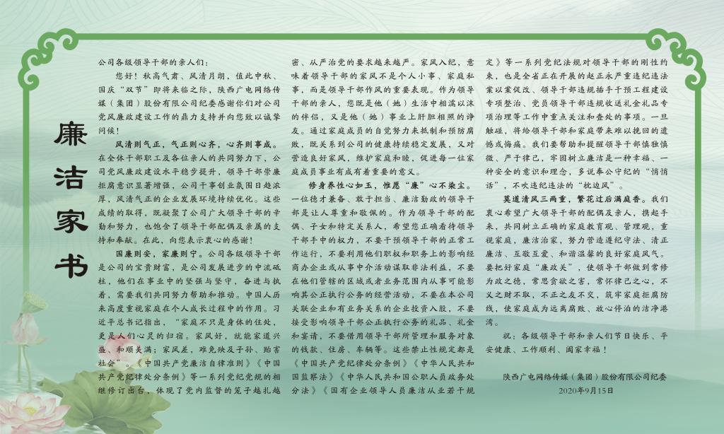 陕西广电融媒体集团陕西广电网络传媒(集团)股份有限公司纪委推出共读“廉洁家书”活动 助推廉洁文化建设