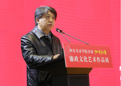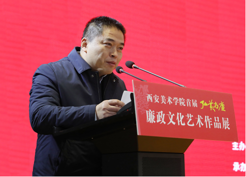 李智军在致辞中指出,廉政文化是中华民族优秀传统文化的重要组成部分,也是社会主义先进文化建设的重要内容。近年来,西安美术学院认真学习贯彻落实习近平总书记关于党建工作、思政工作、教育工作、文艺工作的重要讲话及指示批示精神,树牢“四个意识”、坚定“四个自信”、做到“两个维护”,紧紧围绕立德树人根本任务,为党育人、为国育才,坚持以政治建设为统领,深入推进全面从严治党和党风廉政建设与反腐败斗争,高度重视并持续加强廉政文化建设。本年度,为深入开展第三个纪律教育学习宣传月活动,结合学院专业特色优势,精心组织策划,举办首届“弘美尚廉”廉政文化艺术作品展。此次展览,是一次主题鲜明、富有深刻教育意义的命题艺术创作,是针对全体师生的一次集中廉政教育。旨在加强教育宣传,传递清廉、启迪心灵、涵养清风正气、净化政治生态,为学院立德树人筑牢思想根基,为推动政治文化正气充盈,带动整个社会文化向上向善尽一份力。