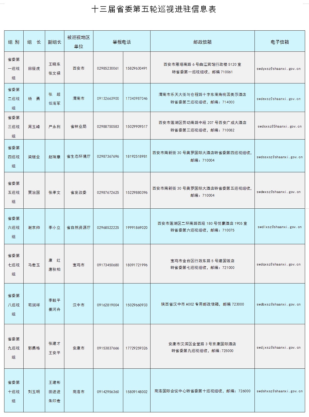根据安排,省委巡视组将在被巡视地区、单位工作1个月左右。巡视期间设值班电话、邮政信箱、电子邮箱等,巡视组受理信访时间截止到2019年6月30日。省纪委监委信访举报受理电话(029—12388)、信箱(西安市雁塔区雁塔路南段十号陕西省纪委监委信访室)和网上举报窗口(http://shaanxi.12388.gov.cn),同步受理涉及秦岭生态环境保护的信访举报。根据秦岭生态环境保护专项巡视工作要求,省委巡视组主要受理反映被巡视地区和单位秦岭生态环境保护方面的问题和线索。对不属于这次专项巡视受理范围的信访问题反映,将按规定转交被巡视地区或单位和有关部门认真处理。