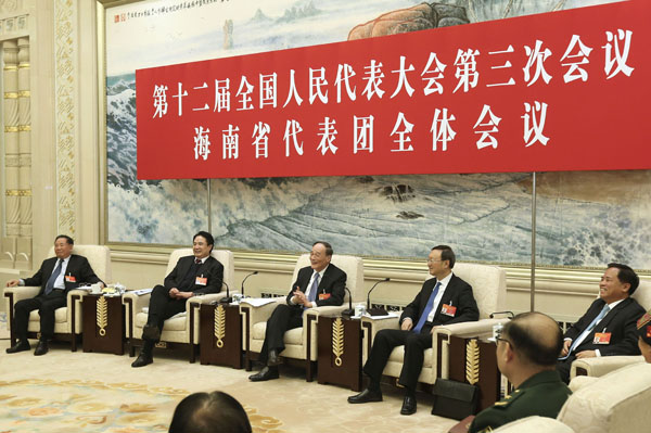 3月8日,中共中央政治局常委、中央纪委书记王岐山参加十二届全国人大三次会议海南代表团的审议。(新华社记者 庞兴雷摄)