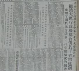 《人民日报》关于撤销大区、合并部分省市的报道。(资料图片)