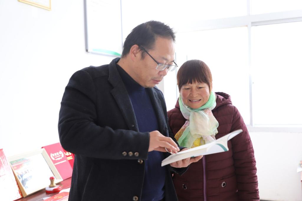 帮扶干部王振(左)为贫困户田金娥送去天麻实用栽培技术书籍。杨帆 摄