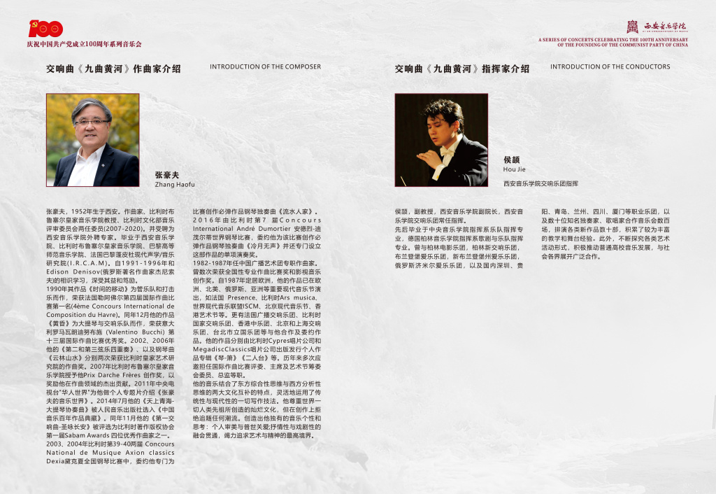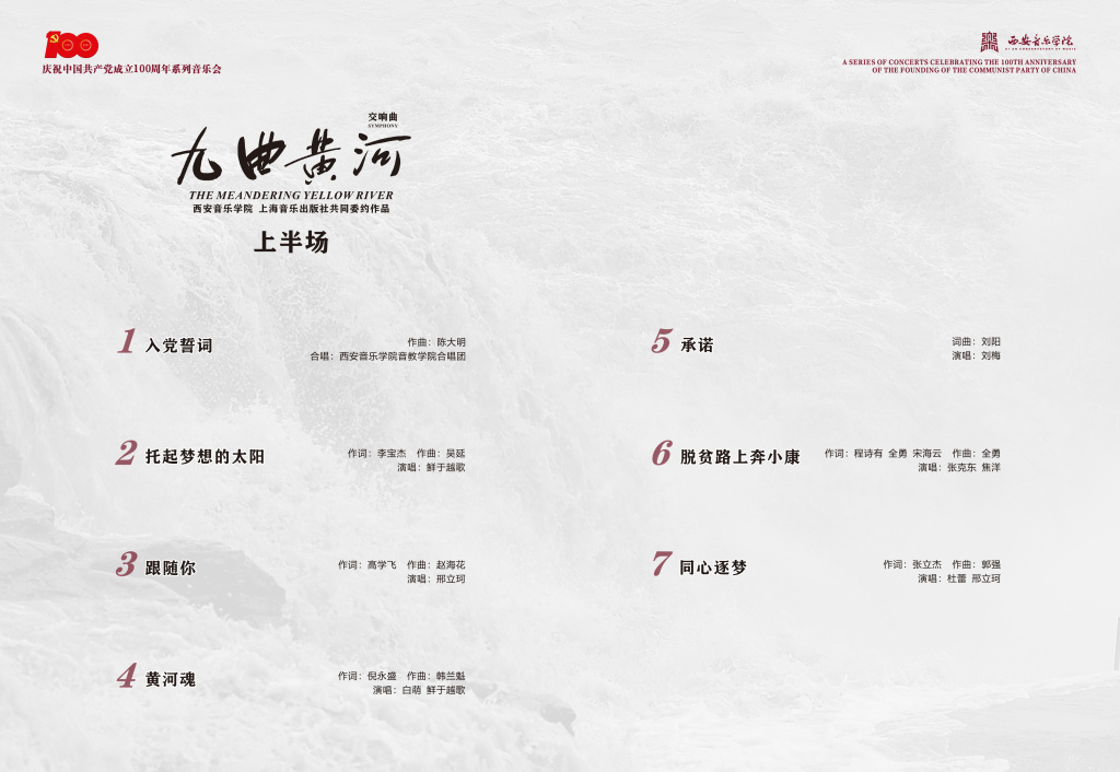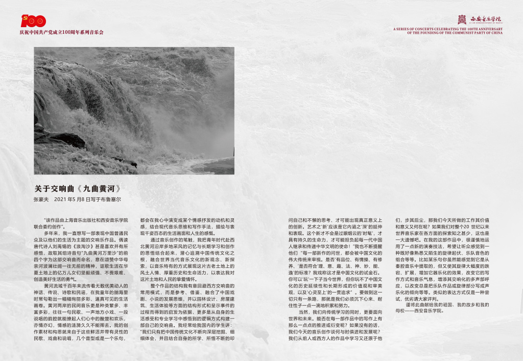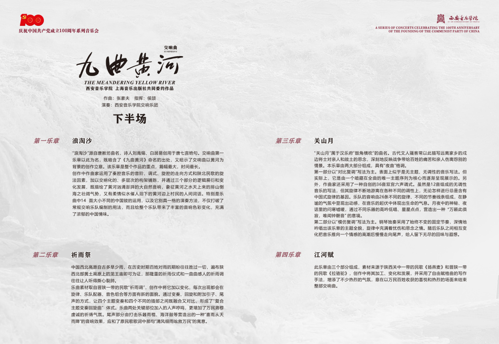 《九曲黄河》交响曲音乐会是西安音乐学院庆祝中国共产党成立100周年系列大型主题艺术实践活动之一,也是学校和上海音乐出版社共同委约的重要音乐作品展演。整场音乐会分为上、下两个半场。