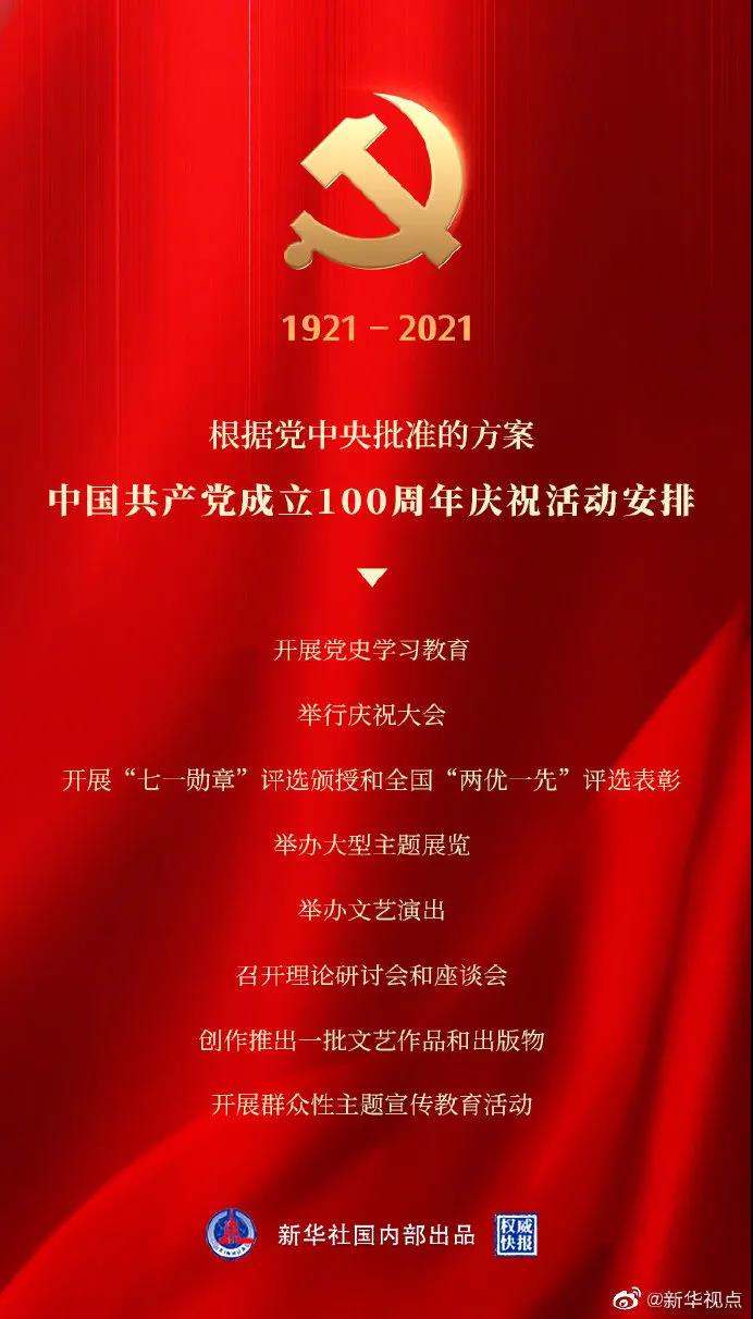 五是举办文艺演出。将举办庆祝中国共产党成立100周年大型文艺演出,邀请党和国家领导人、获得功勋荣誉表彰的代表、基层党员和群众代表等各界人士来观看。
